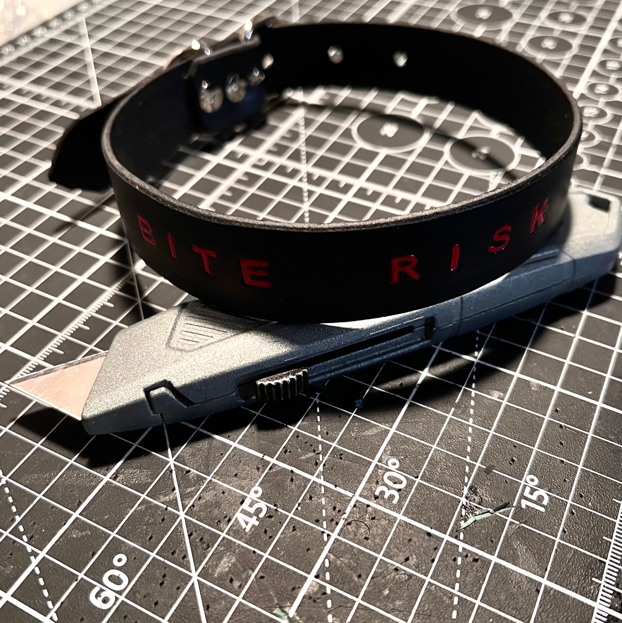 Black leather collar with BITE RISK stamped into it and painted red. Sealed with a protective finish.