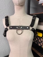 Bulldog style chest harness with large bondage ring and four adjustable buckles for sizing. Sealed with a protective finish and made from heavyweight leather.