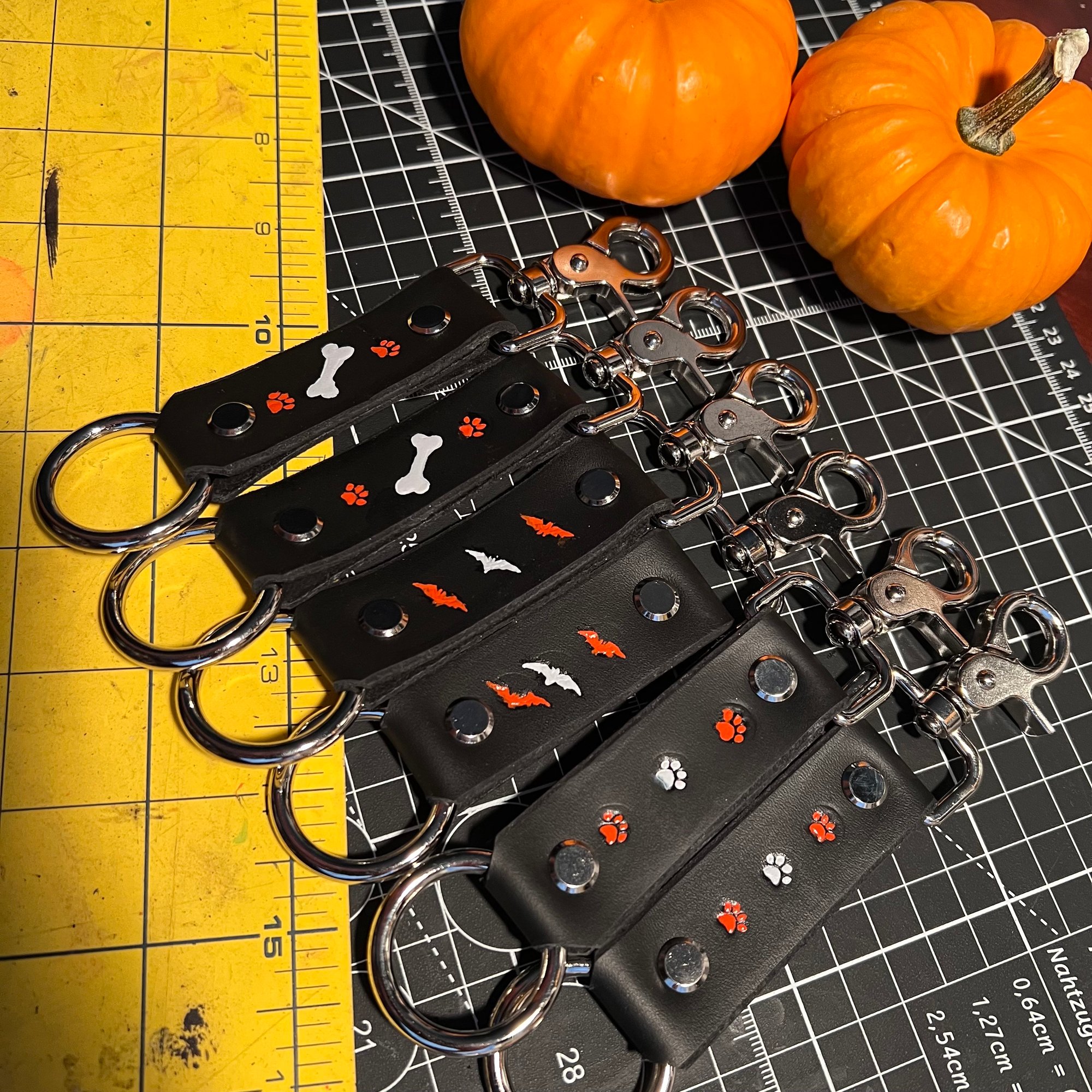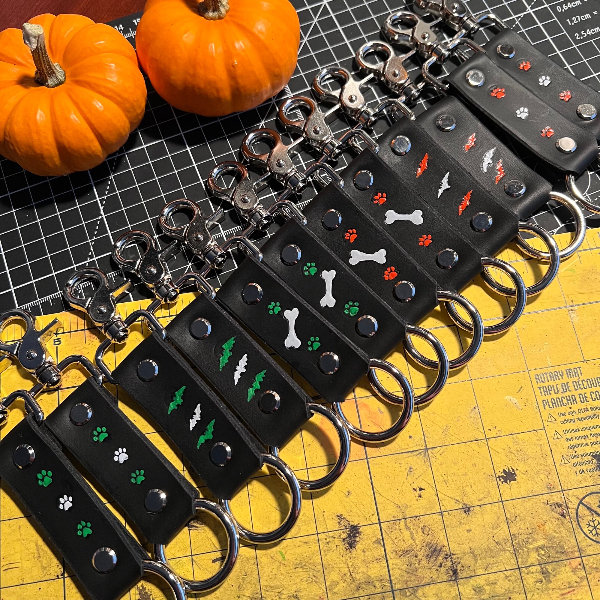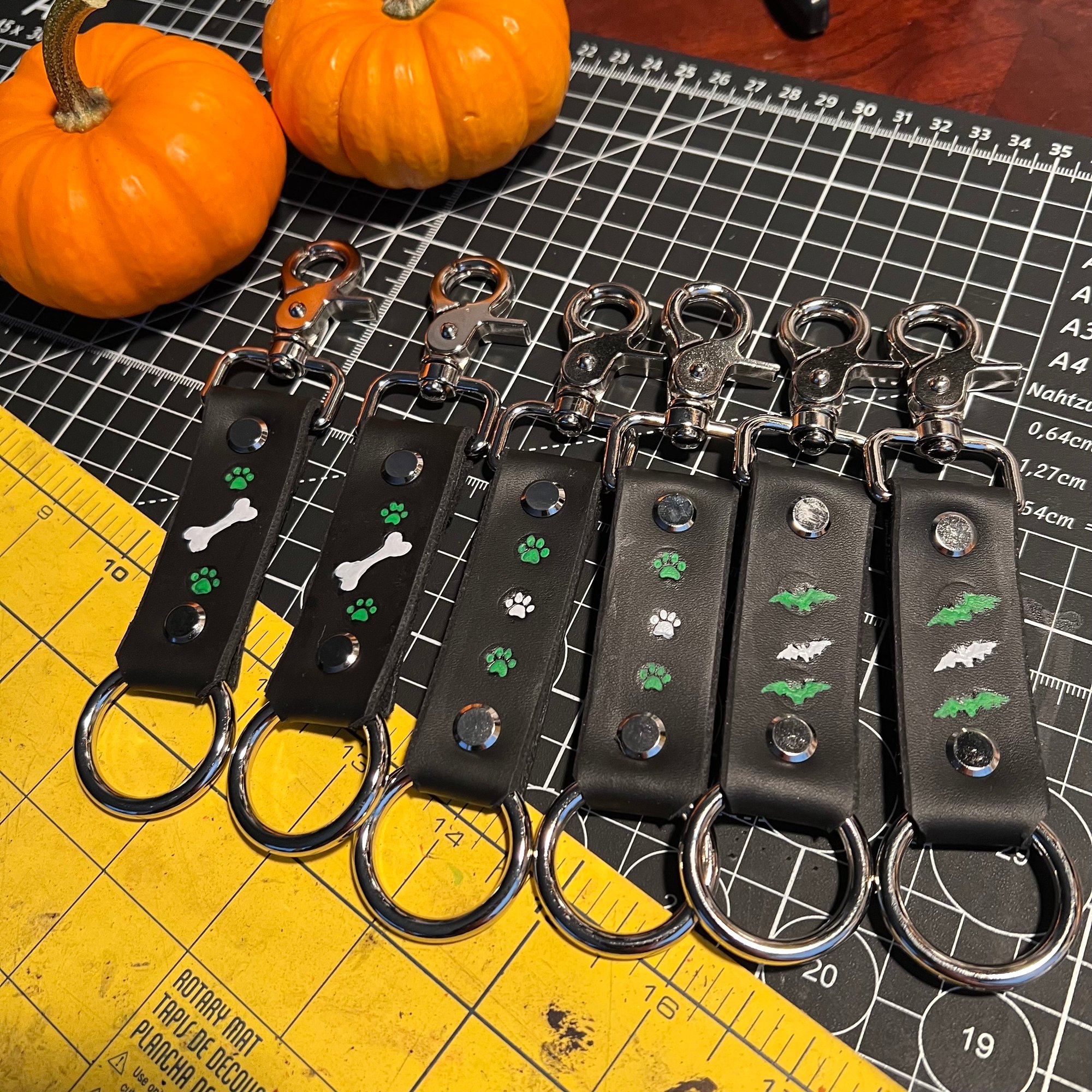Black leather keychain with a one inch o-ring. Sealed with a protective finish.