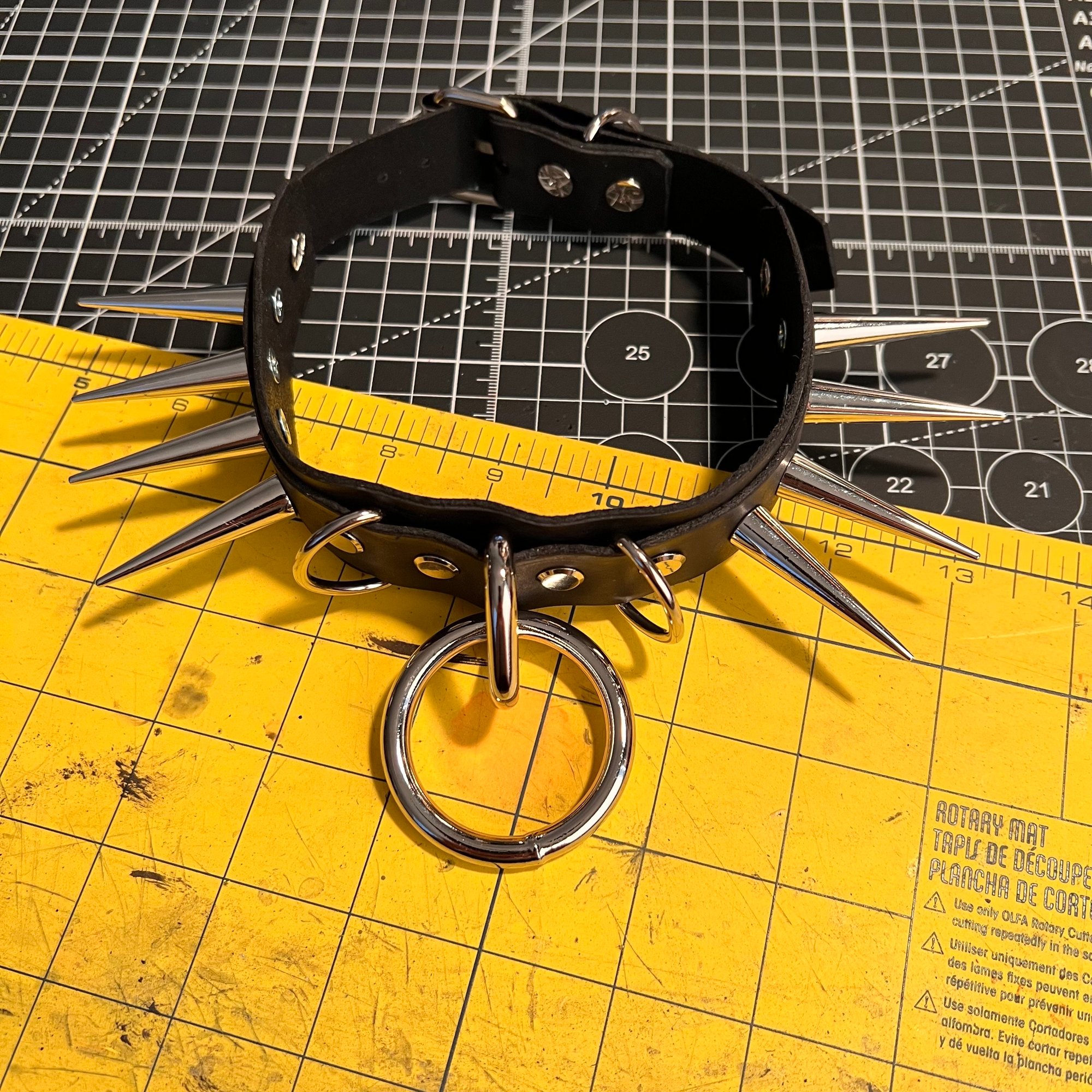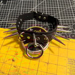 Heavy duty long-spiked bondage collar. Made of high-quality leather and sealed with a protective finish. 1.5" wide.